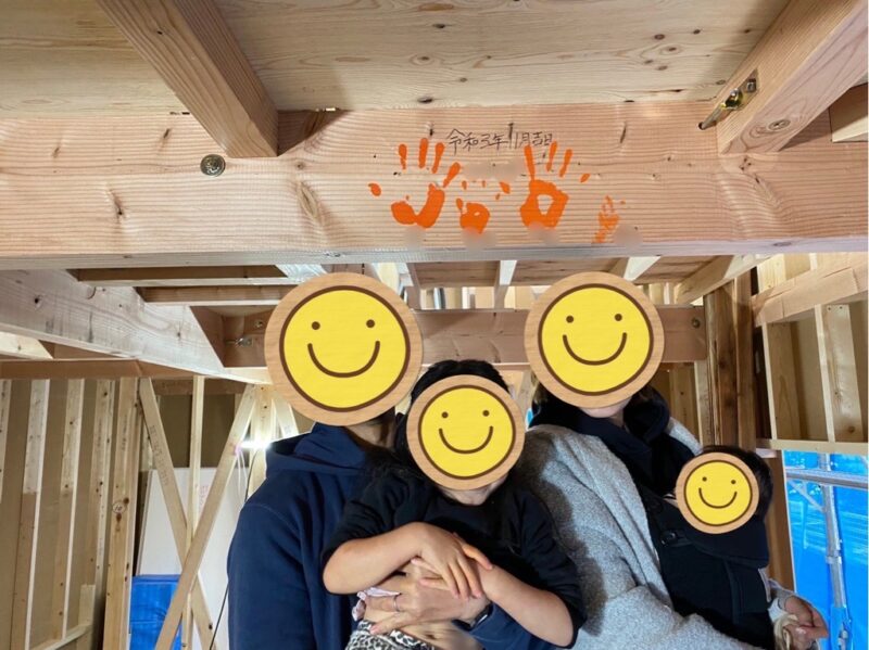 先日、上棟した骨組みの大きな梁に記念としてご家族の手形を押して頂きました。
