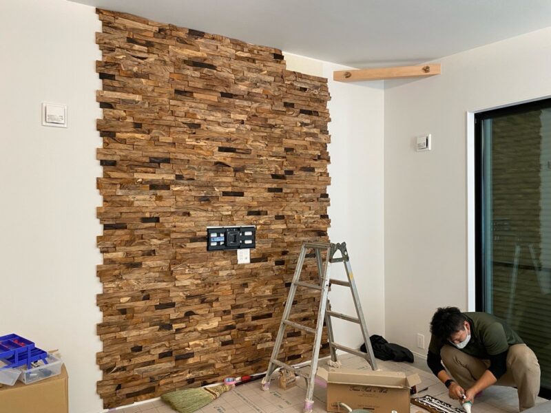 今日は現場監督と一緒に壁掛けテレビ背面のアクセント壁を貼ってみました。