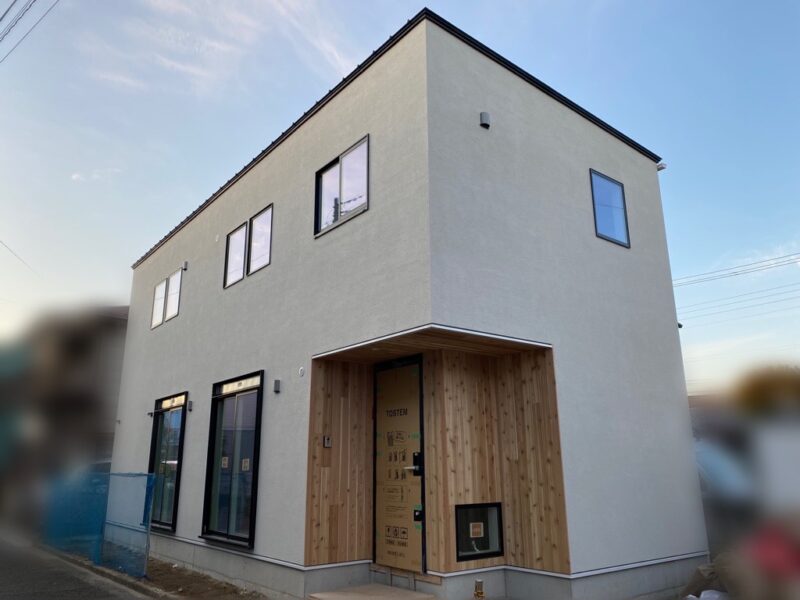 新築現場は足場も外れ、これから外構工事といったタイミングですが、モルタル仕上げの白い外壁がとれも綺麗で嬉しくなりました!
