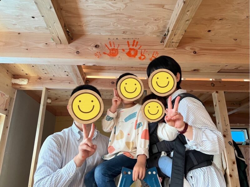 ご家族の家の骨組みである柱や梁に手形を押して記念写真。