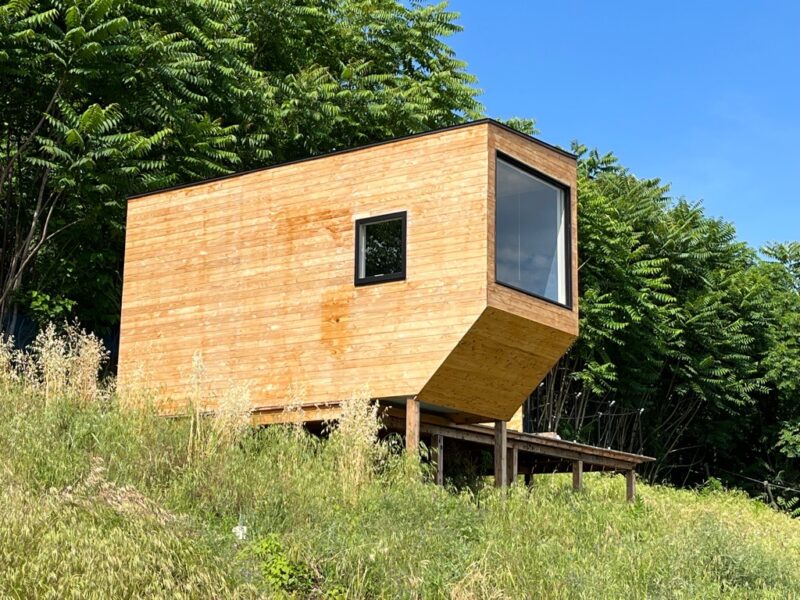 登山のように少し山を登った先にある杉板貼りのタイニーハウス。