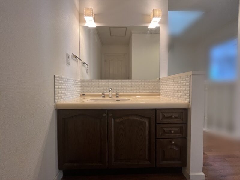 洗面台前にタイルを貼ったりするリニューアル工事。