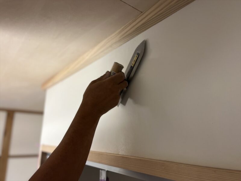 いつもお世話になっている現在メーカーさんのたまごの殻を使った漆喰を綺麗にコテ押さえして仕上げていきます。