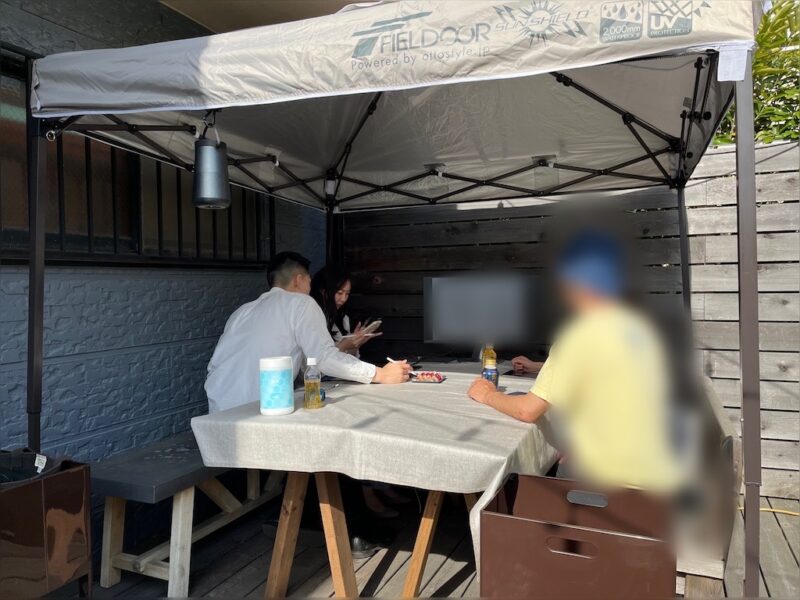 ウッドデッキに日除けを設置してワンちゃんも一緒に家づくりの楽しいお話に参加してくれました!