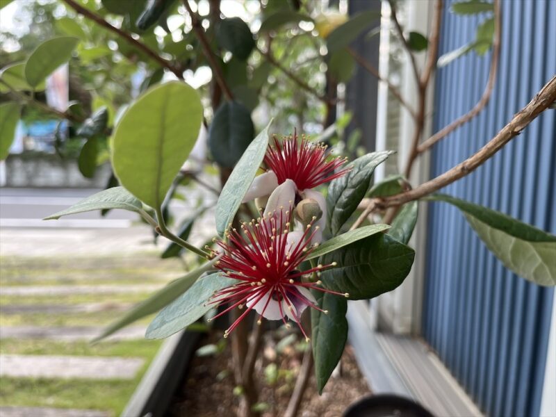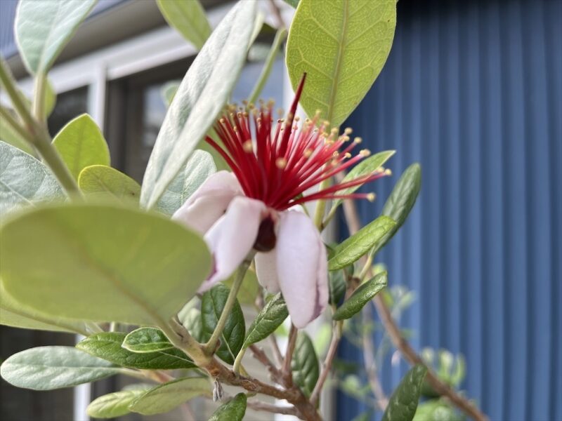 少し前にショールーム横のプランターにあるフェイジョアの木に綺麗に花が咲いており写真を何枚か撮ってみました。