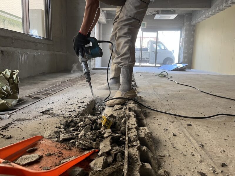 まずは厨房機器のガスや水道配管などの作業のため下準備に弊社の横山が作業中です!
