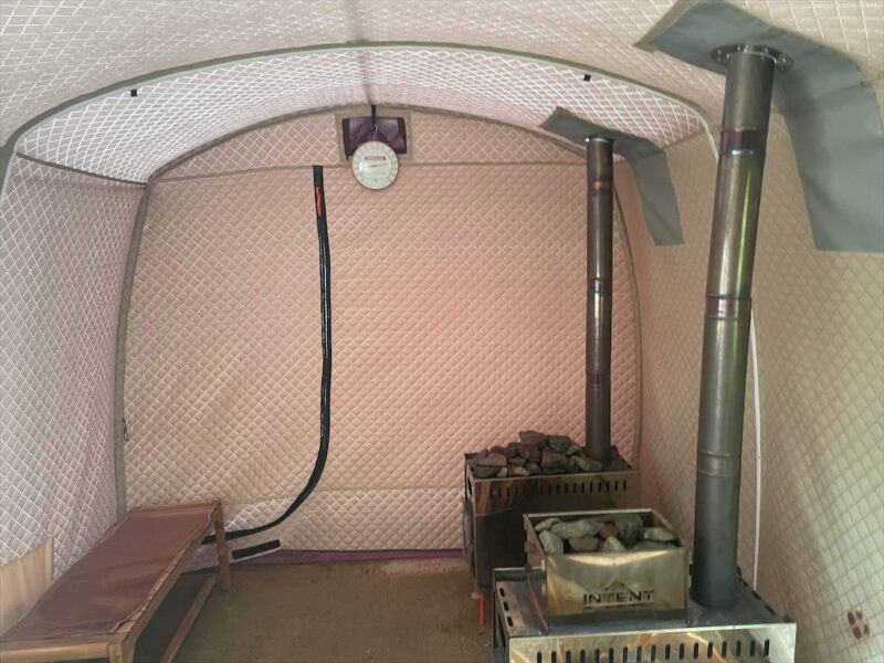 二つくらいの区画に仕切られ私も自宅で愛用しているモルジュのテントサウナのひとまわり大きいサイズが設置され、中には薪ストーブがダブルで設置。