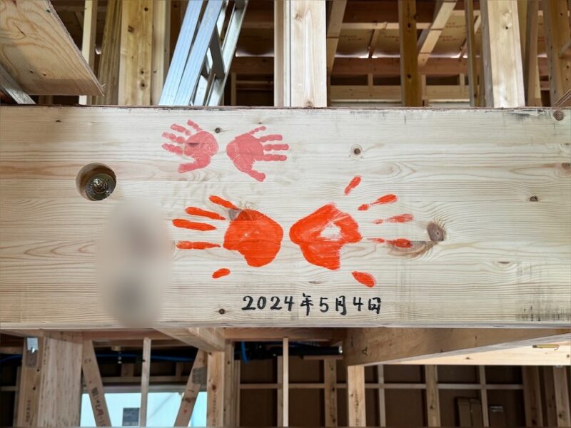 そんな連休中日の本日、進行中である横浜市の注文住宅にお施主様をお招きして上棟した建物の大きな梁にご家族の手形を押す機会を設けさせていただきました。