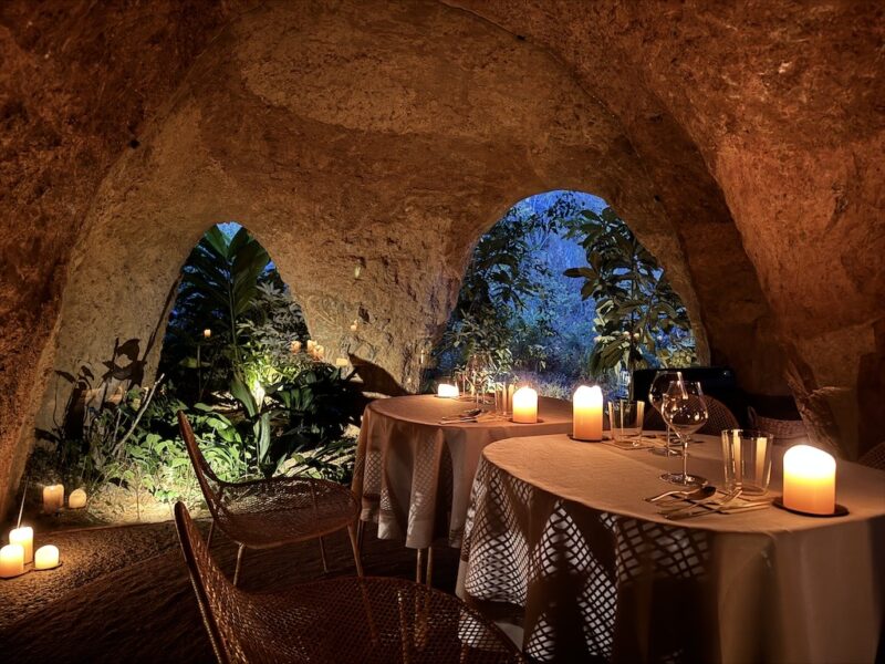 その空間の造形や素材感に感動しつつ、夜が訪れる頃にはろうそくの灯りが建物全体を幻想的に彩り、落ち着いた雰囲気の中でいただく美味しい料理は格別でした。