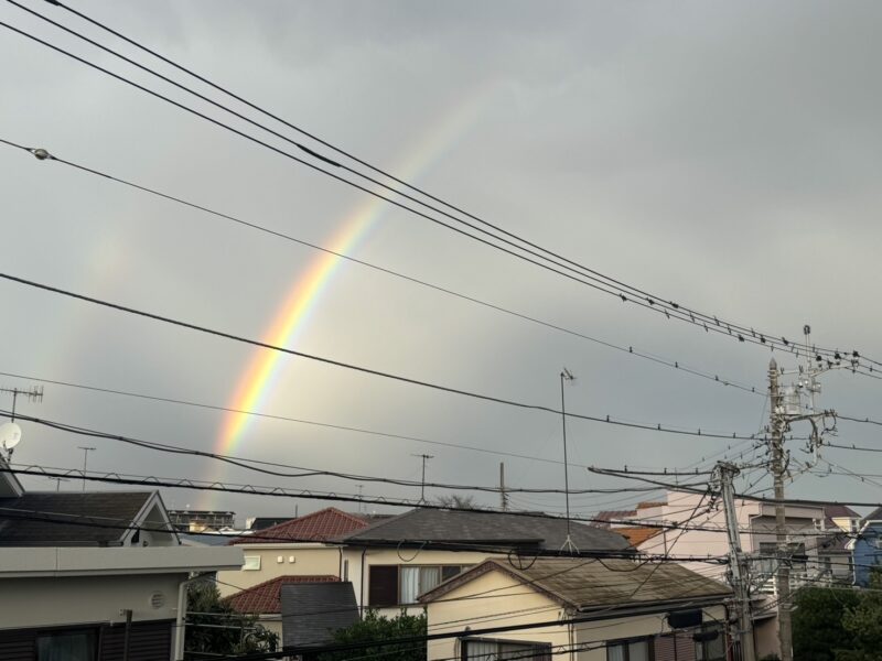 雨が上がった夕方、会社に戻ると、空には大きく綺麗な虹がかかっていました。