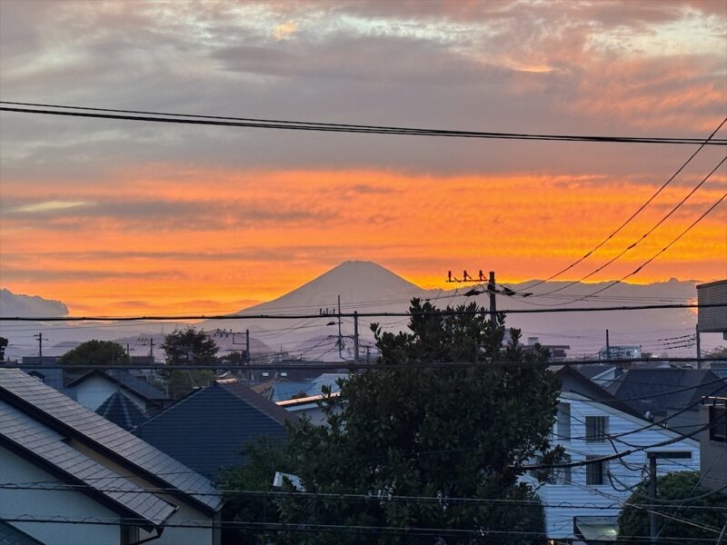 夕方には空がとても綺麗で、会社の外に出てみると、富士山と夕焼けが重なる美しい景色が広がっていました。