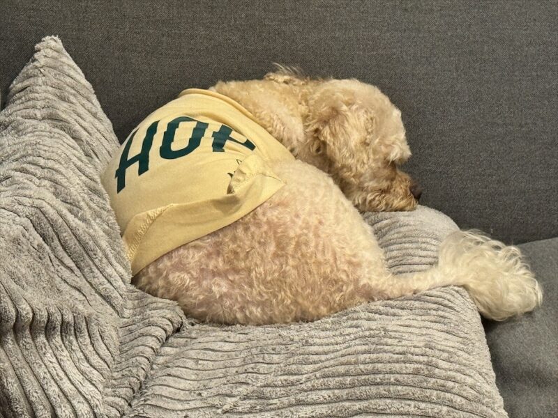 ふと静かになったなと思って足元を見ると、愛犬たちはすっかりお休みモード。