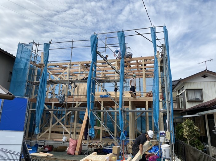 今回もクレーンが使えない立地の為、大工さん達は手おこしで重たい梁を持ち上げて作業をしてくれました。