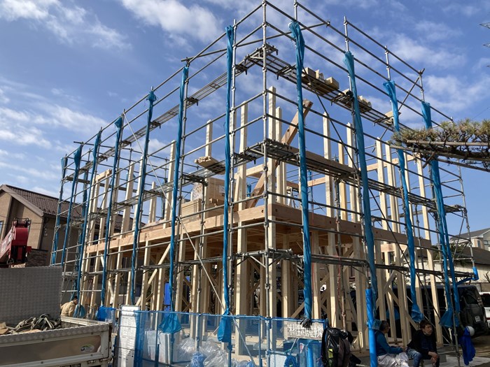 ご実家のお庭の一角に計画され、ご両親にも見守られ立派に上棟する事ができました。