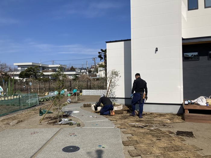 そして上棟現場からの帰り道にある茅ヶ崎のオーナー様宅では造園工事が行われました。