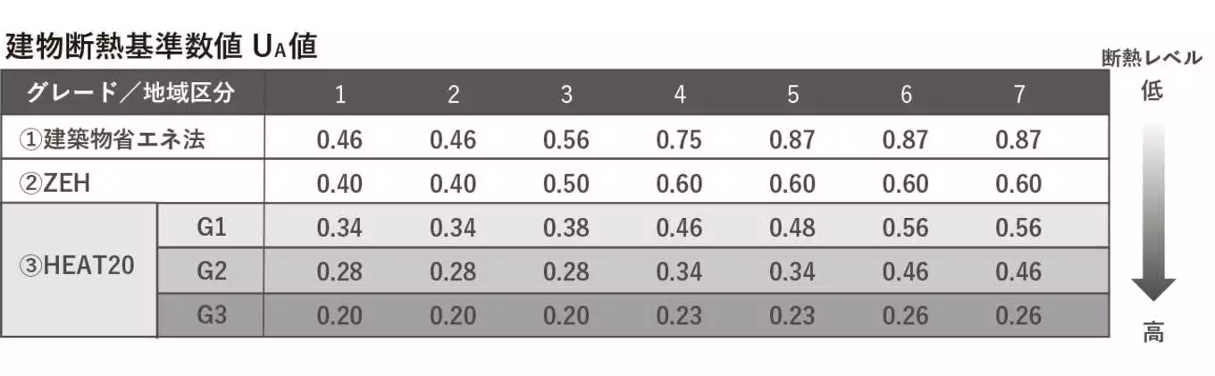 住宅の断熱性は「UA値」という指標で表されます。この数字が⼩さいほど熱が逃げにくい「高断熱な家」になります。