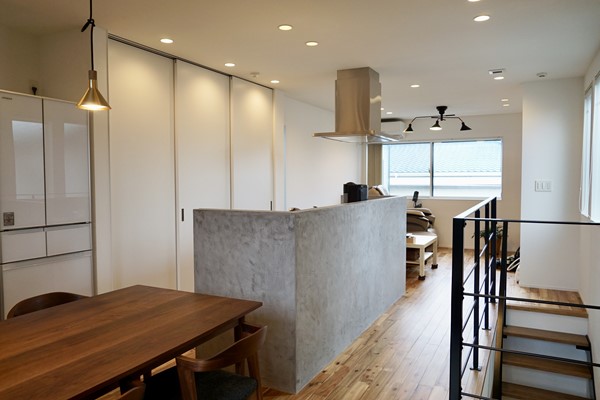 モルタルのキッチンは、松尾建設さんの雑貨屋さん「korb」( https://korb.jp/ )のレジカウンターを見てピンと来て。システムキッチンと組み合わせる造りなので、キッチンの高さは青木社長と一緒にショールームに行って選びました。初めは85cmにしていたんですが、後で思い直して90cmに変更しましたし、立ち上がりの高さも、一度決めた後にやっぱりしっくりこなくて数cm高くしてもらいました。ずっと使うものなので、その数cmが後々気にならないようにしておきたかった。そういう細かい変更にも「まだ間に合うよ」と応えてくださいました。