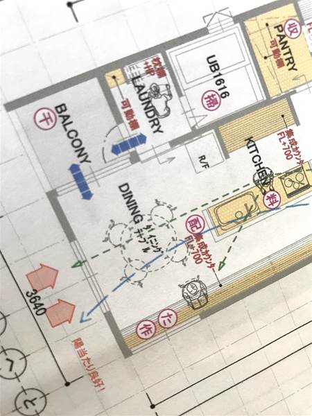 アヤコさん: 私はとにかく家事の動線をコンパクトにしたかったので、キッチンの近くに水回りを持ってきて、洗濯機もそこで。クローゼットも各部屋につくるんじゃなく、ファミリークローゼットという形で1ヶ所にして。斎藤先生ご自身が家事をしっかりなさる方らしく、だいたいのことが2階で効率良く収まるようになってるんです。図面に家事をしている時の目線や動作が書き込まれているんですよ。