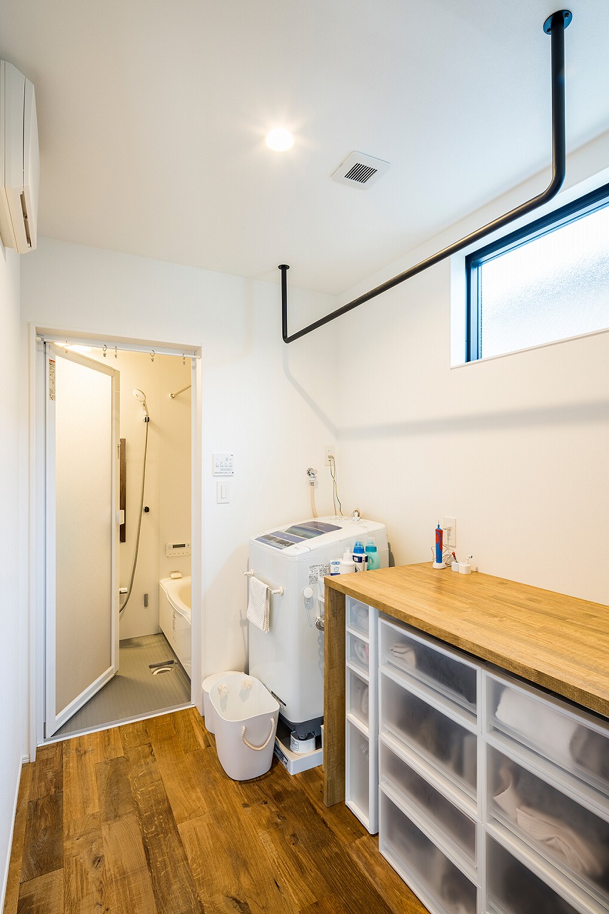 ノゾミさん: お風呂とは逆に脱衣所を広くした理由は、脱衣所で使う物は全部そこに置いておきたかったから。例えば下着などの着替えや、落ちた髪の毛を掃除する道具など。この家はベランダをつくらなかったので、洗濯物を干すスペースも必要でした。家族が毎日使うこのスペースが狭いと、暮らしを窮屈に感じてしまう気がして。