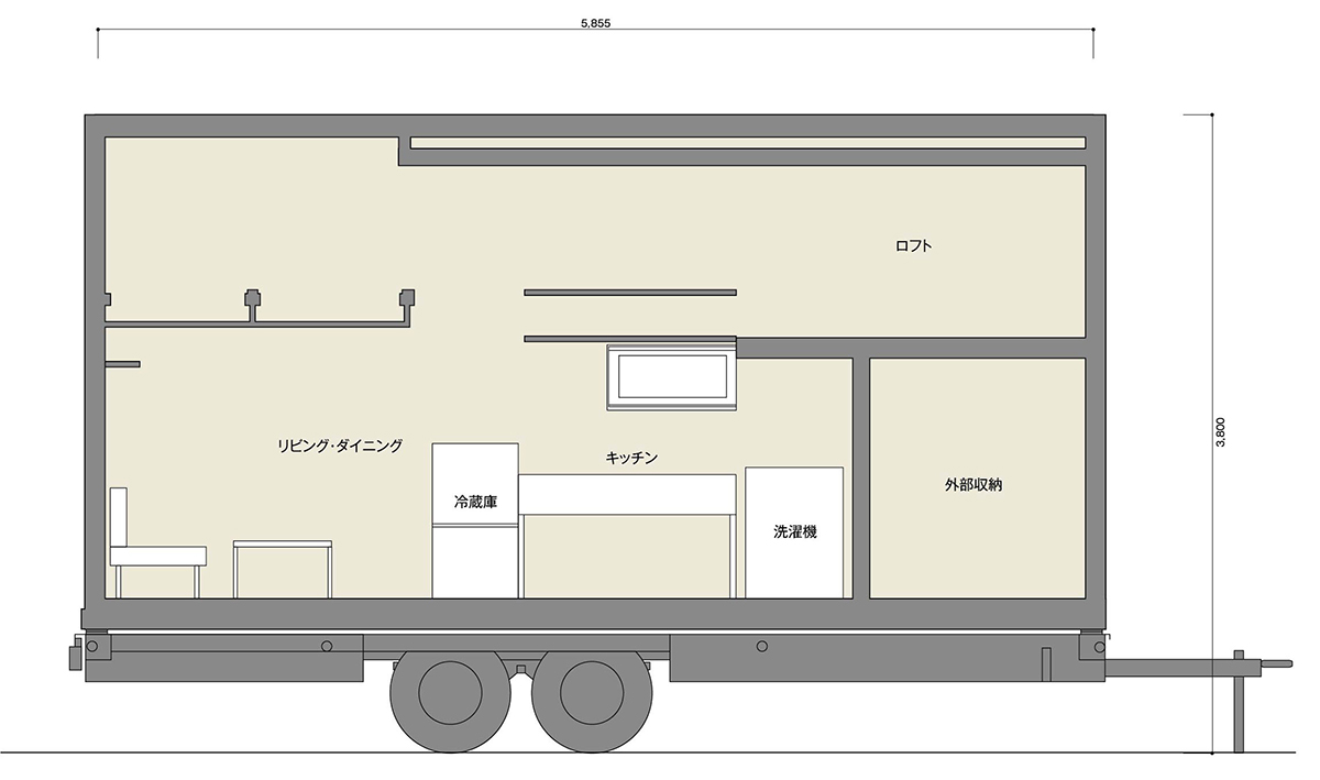 | 基礎 | トレーラーシャーシ(基礎なし) | 仕上げ | 外壁:構造用合板塗装仕上 |